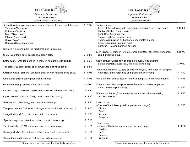 Hi Genki [at 6680 Southoaks Crescent, Burnaby, BC] does not provide an official take-out menu; therefore, the following scan is based on a low-quality photocopy of its menu. There is a "daily" special menu that does not include on this page.